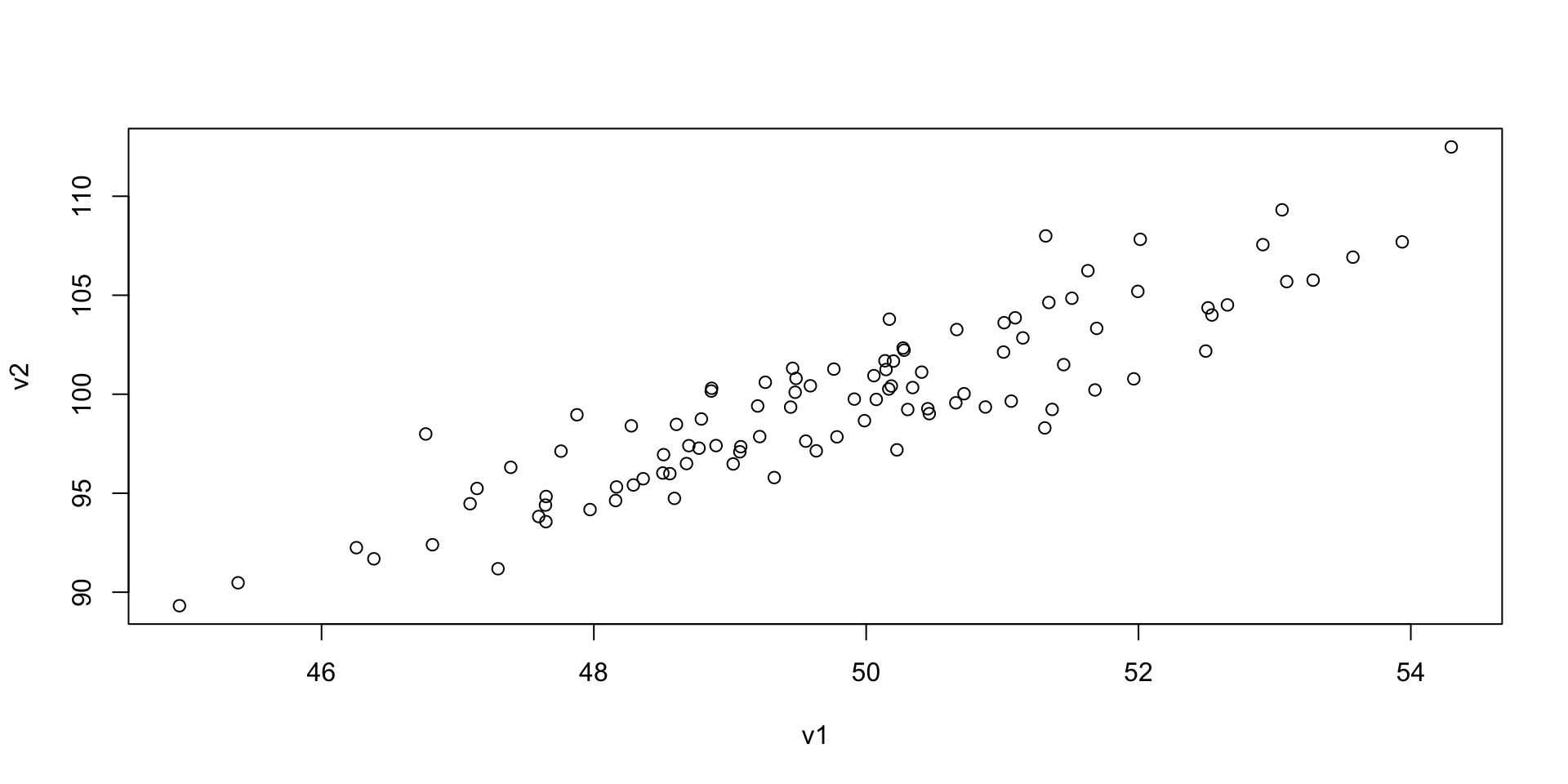 v1 =rnorm(100, mean =50, sd =2)v2 = v1 *2+rnorm(100, mean =0, sd =2)