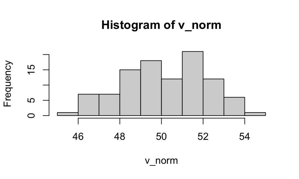 Try changing the different parameters of rnorm and then plotting the resulting vector again using hist. What do you notice about changing the mean or sd?