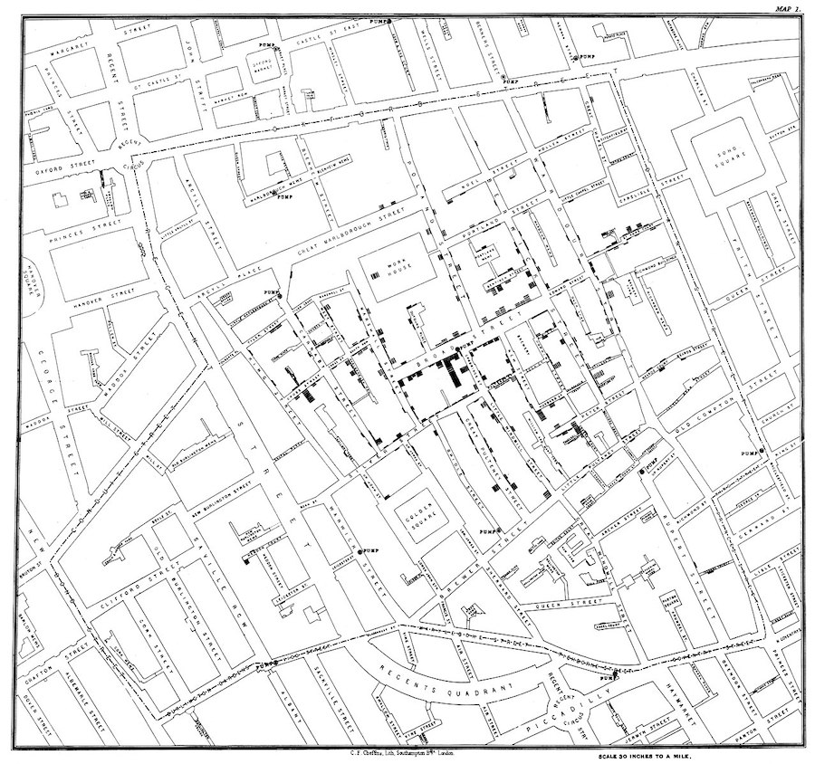 John Snow (1813-1858) was a physician whose visualization of cholera outbreaks helped identify the source and spreading mechanism (water supply).