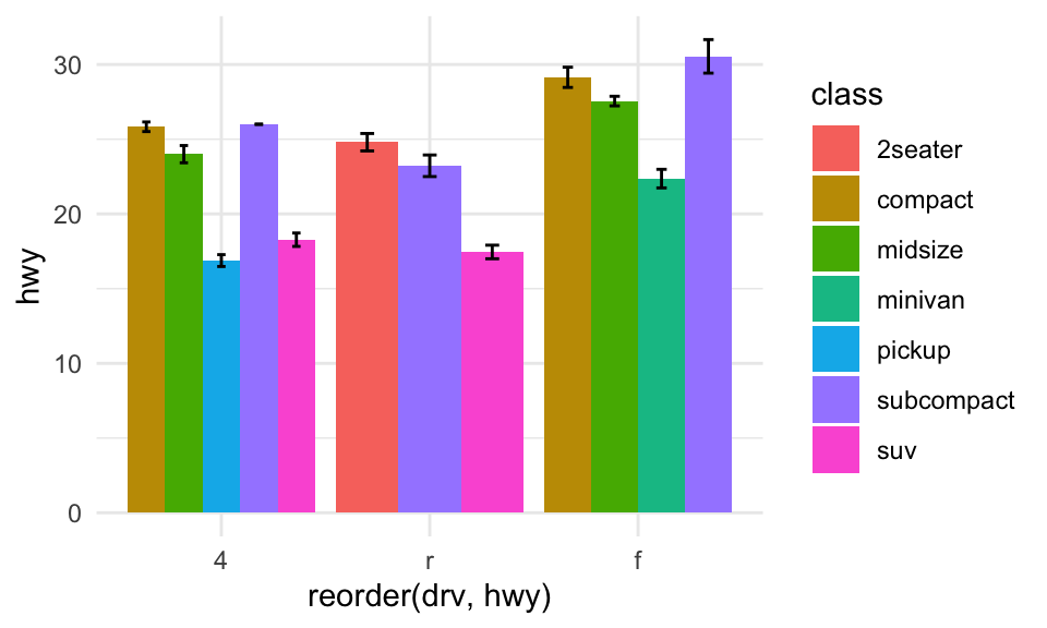 ggplot(aes(x = reorder(drv, hwy), y = hwy, fill = class)) +