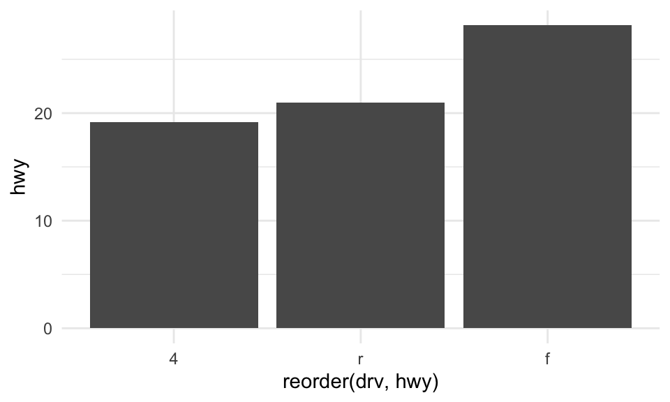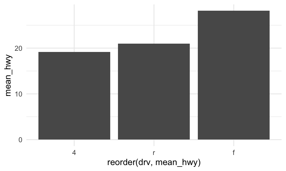 ggplot(aes(x = reorder(drv, mean_hwy), y = mean_hwy)) +