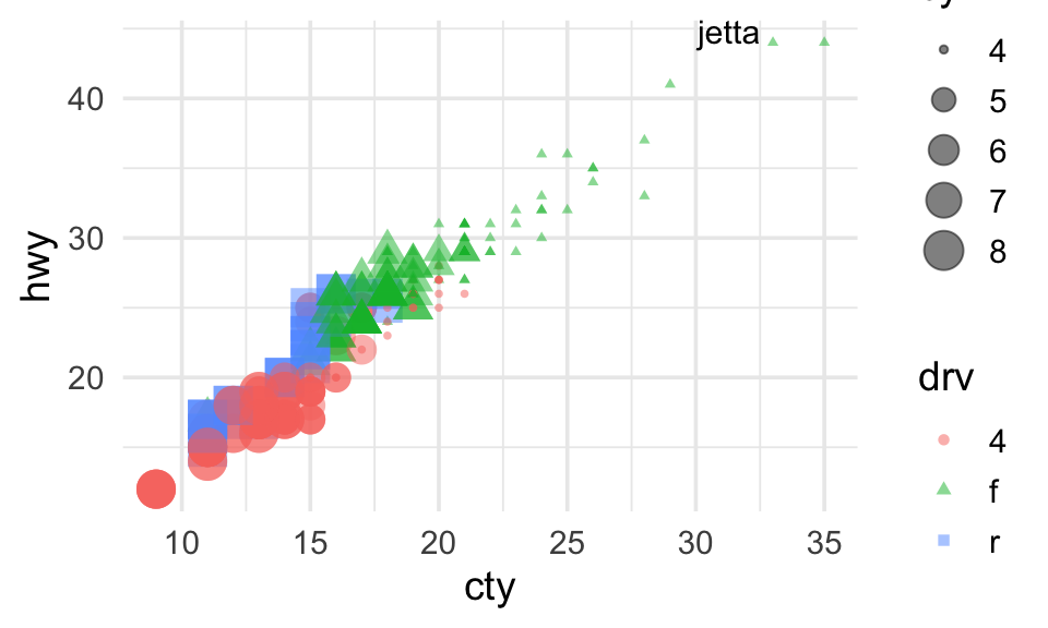 ggplot(aes(x = cty, y = hwy, color = drv, size = cyl, shape = drv)) +