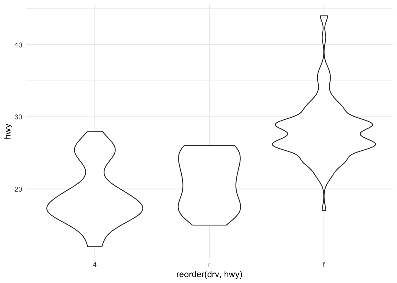 ggplot(aes(x = reorder(drv, hwy), y = hwy)) +