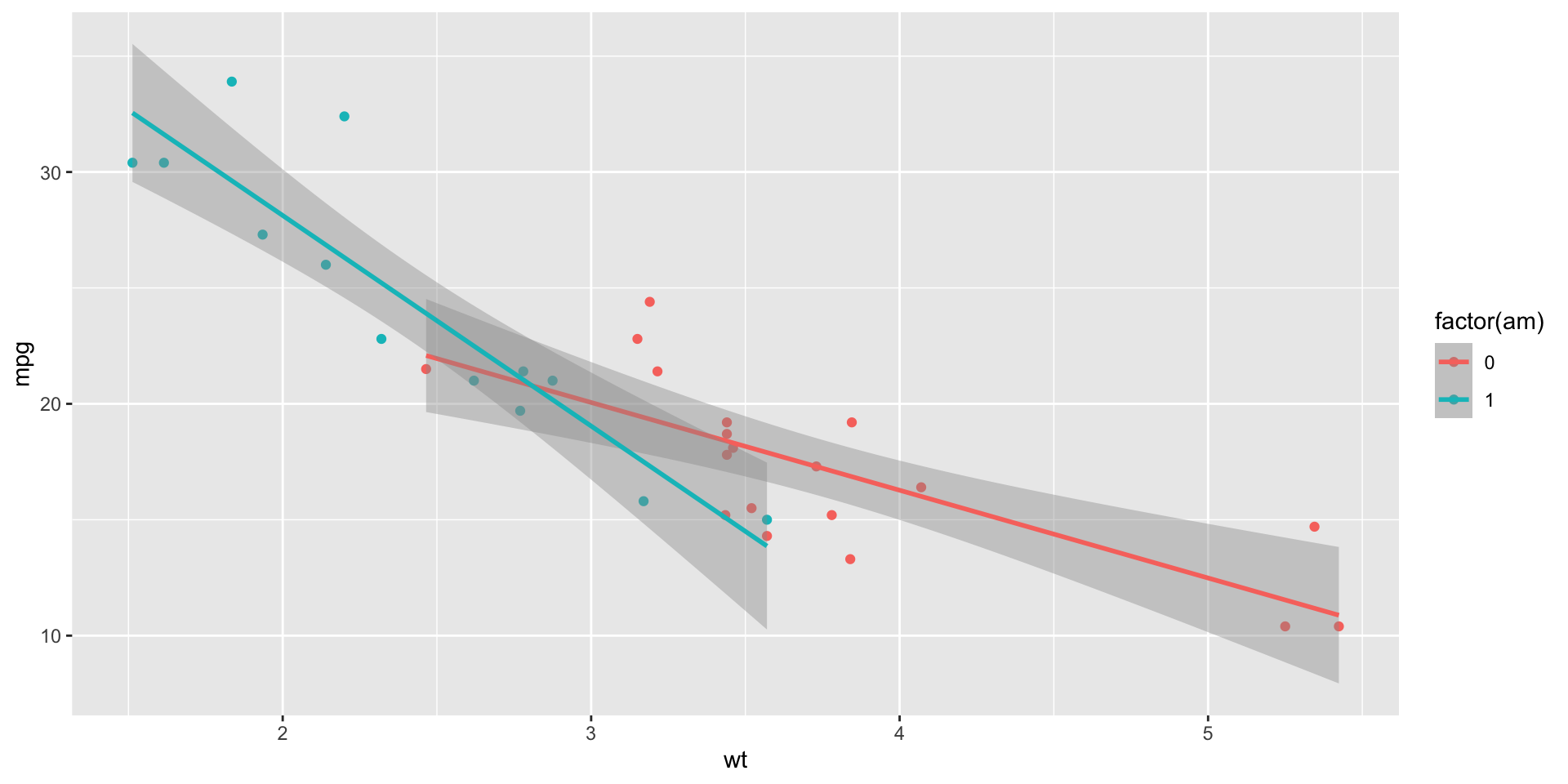 am = 0) with wt = 0 have expected mpg of 31.wt: As wt increases, we expect automatic cars to decrease mpg by about 3.7.factor(am): Holding wt constant, manual cars have an expected mpg of about 14 more than automatic cars.wt correspond to even sharper declines in expected mpg.