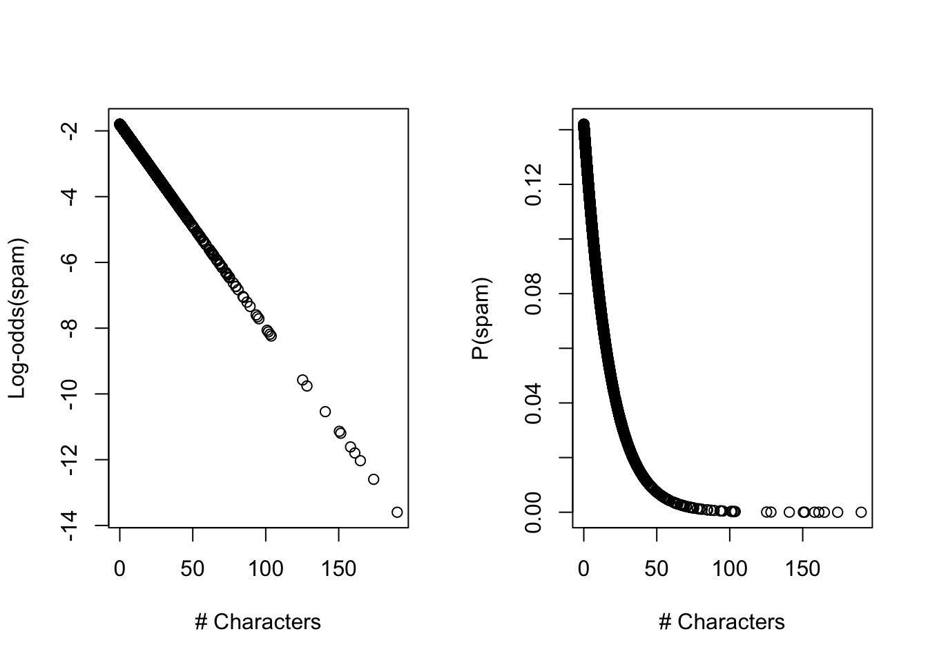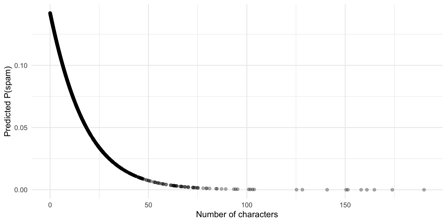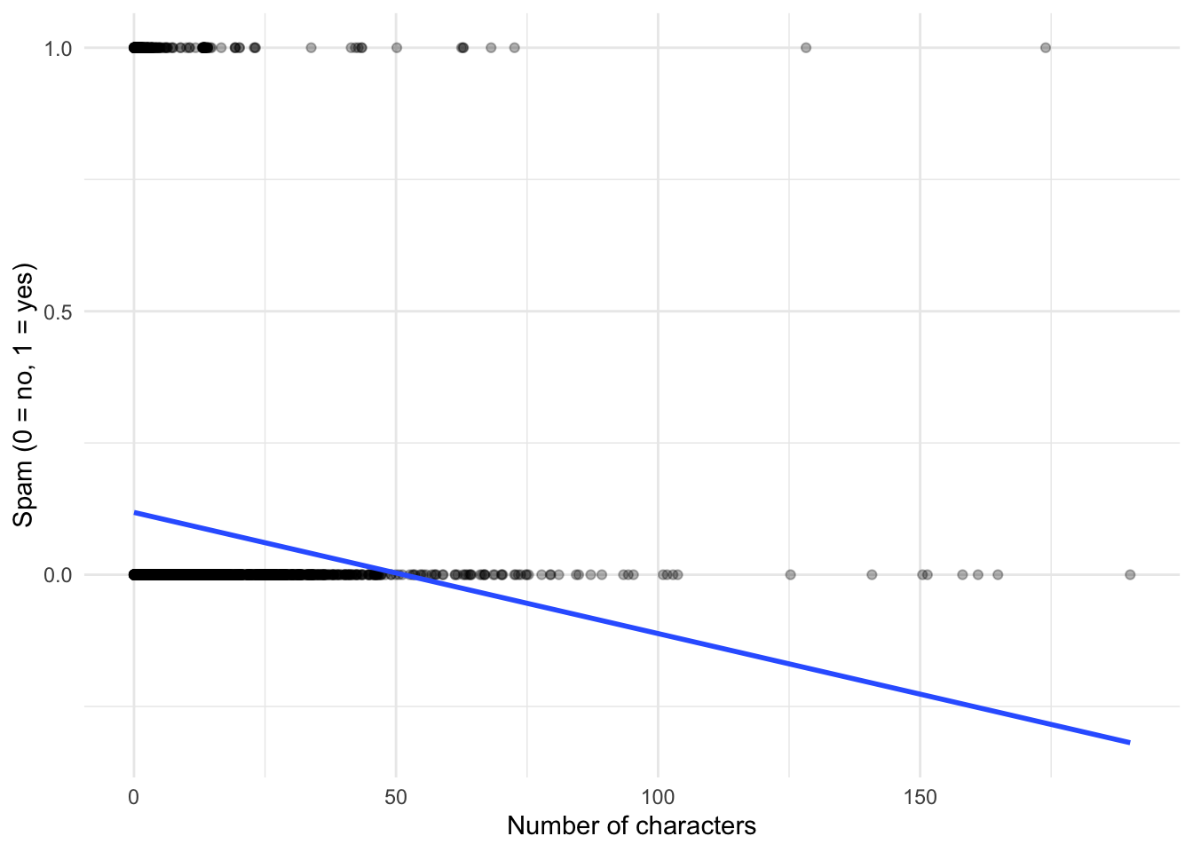 ggplot(df_spam, aes(x = num_char, y = spam)) +geom_point(alpha =0.3) +geom_smooth(method ="lm", se =FALSE) +labs(x ="Number of characters",y ="Spam (0 = no, 1 = yes)") +theme_minimal()