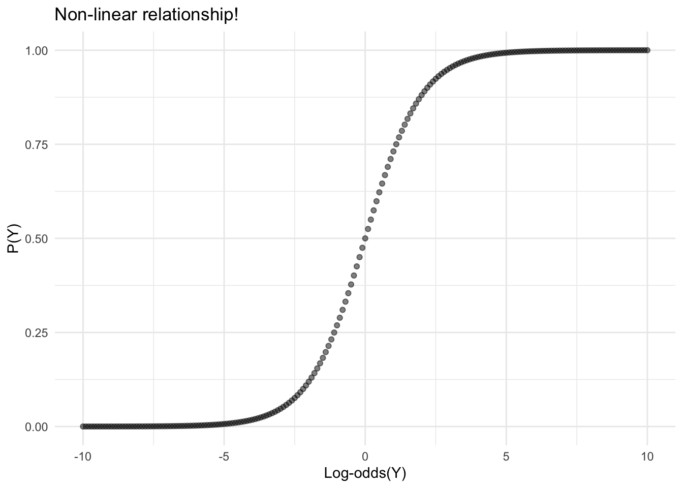 p <-seq(0.01, 0.99, 0.01)odds <- p / (1- p)ggplot(data.frame(p, odds), aes(x = p, y = odds)) +geom_point() +labs(x ="P(Y)", y ="Odds(Y)", title ="Odds(Y) vs. P(Y)") +theme_minimal()