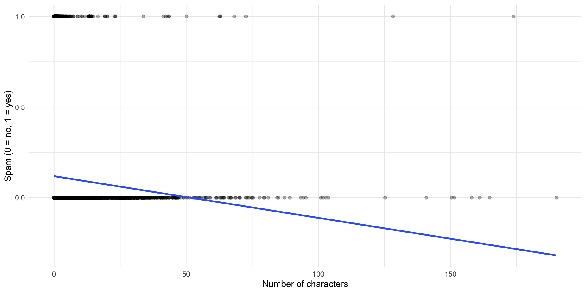 ggplot(df_spam, aes(x = num_char, y = spam)) +geom_point(alpha =0.3) +geom_smooth(method ="lm", se =FALSE) +labs(x ="Number of characters",y ="Spam (0 = no, 1 = yes)") +theme_minimal()