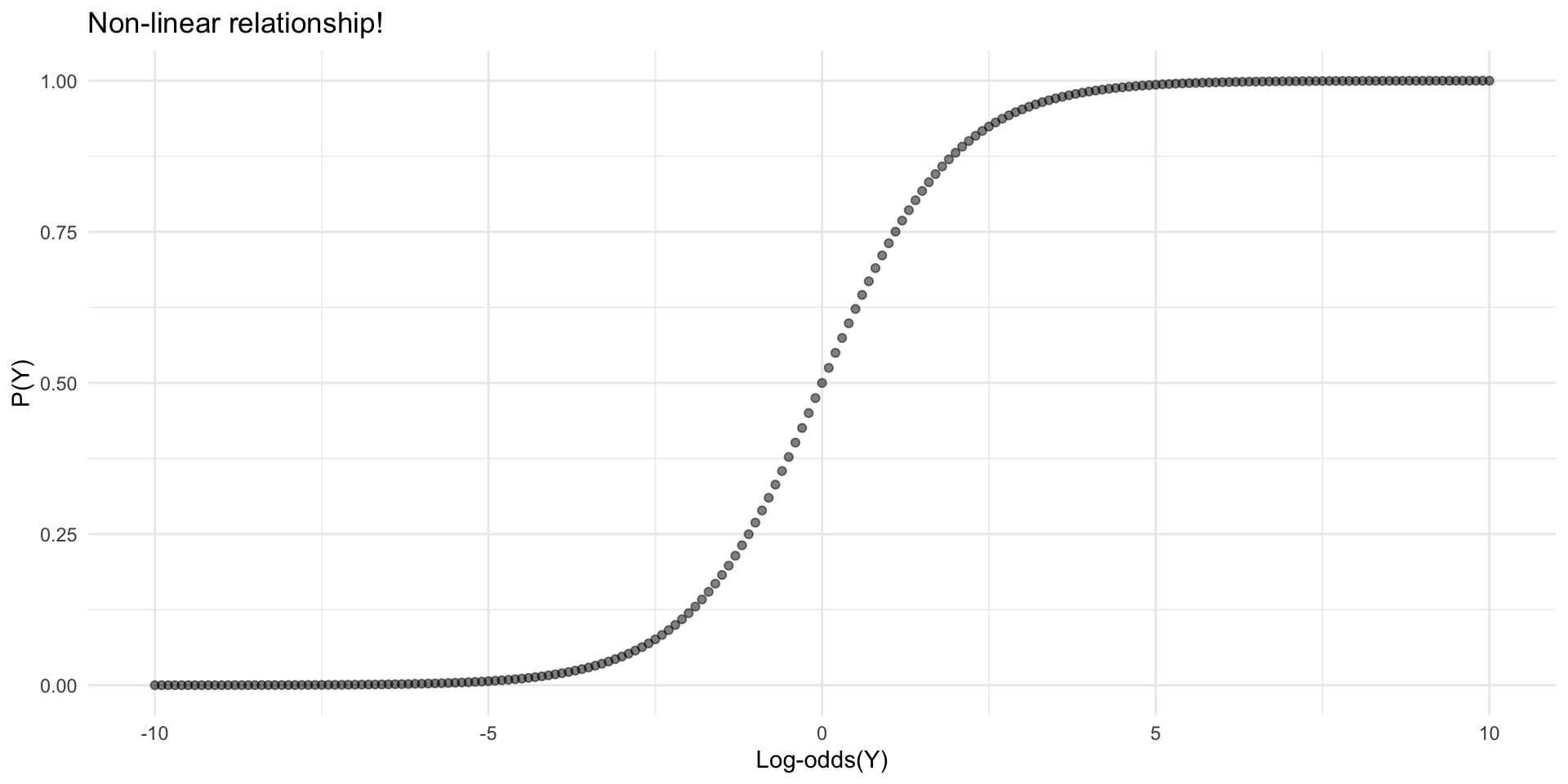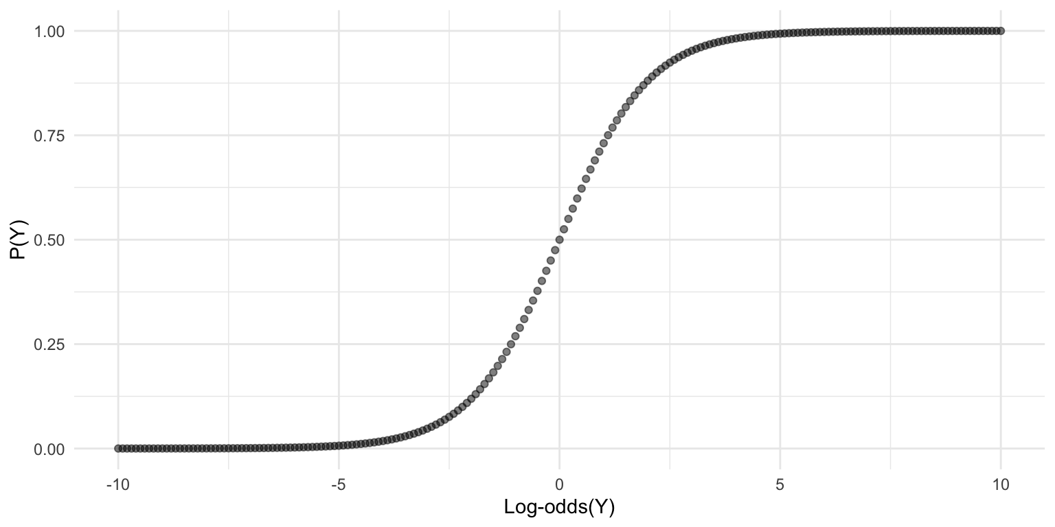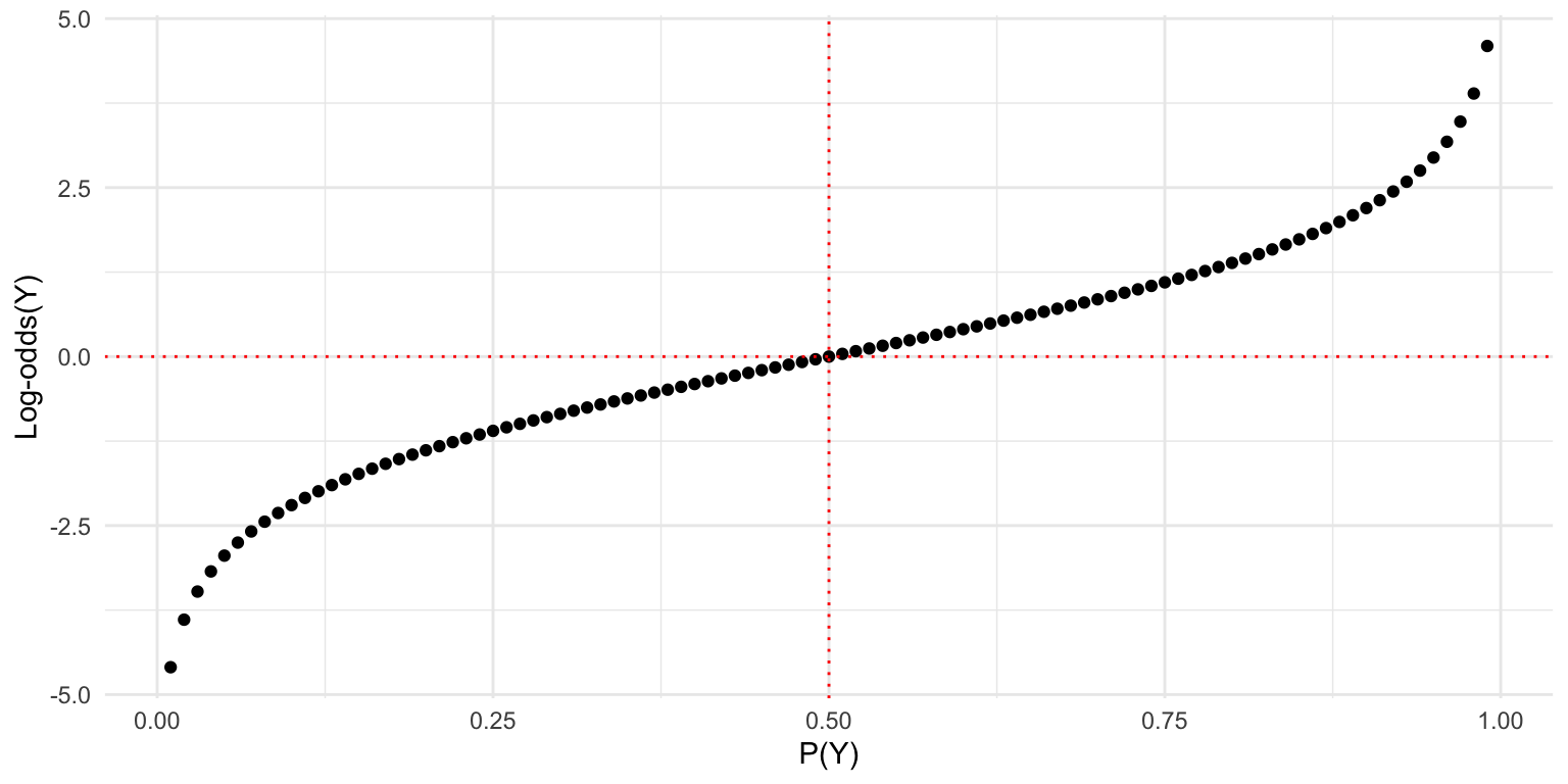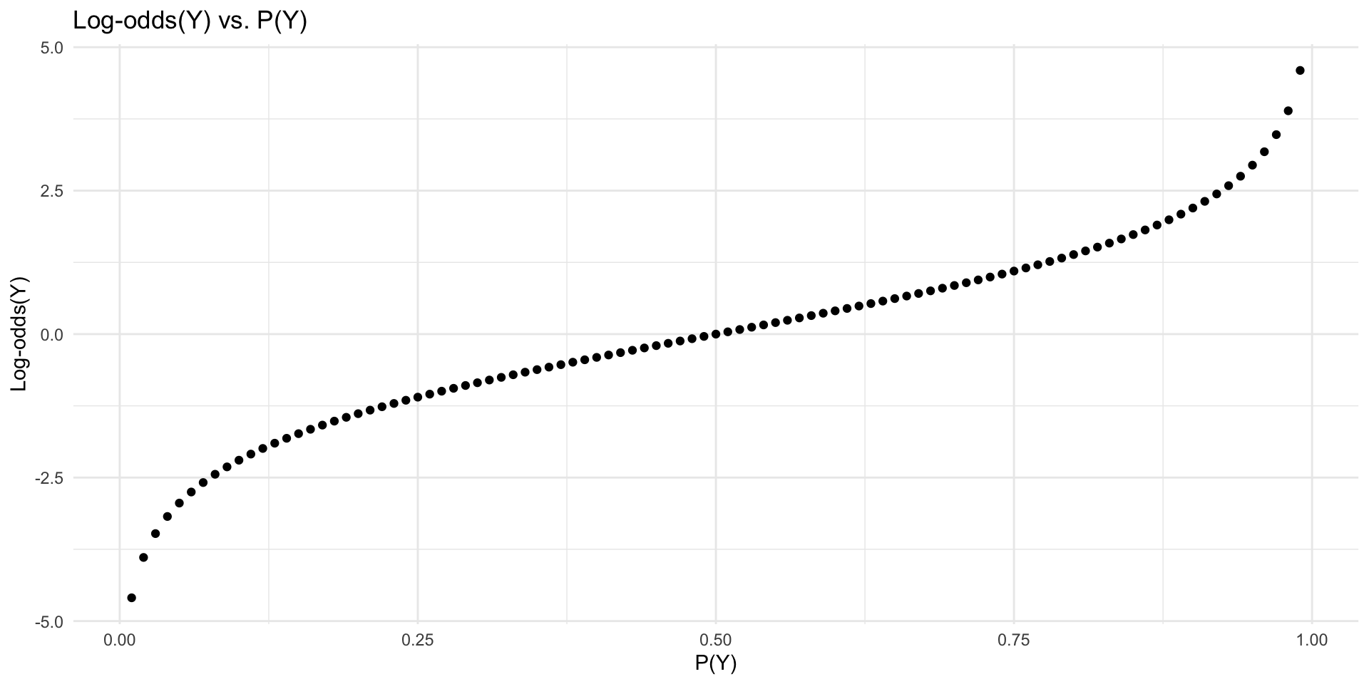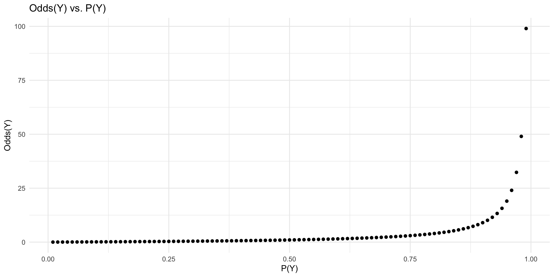 p <-seq(0.01, 0.99, 0.01)odds <- p / (1- p)ggplot(data.frame(p, odds), aes(x = p, y = odds)) +geom_point() +labs(x ="P(Y)", y ="Odds(Y)", title ="Odds(Y) vs. P(Y)") +theme_minimal()