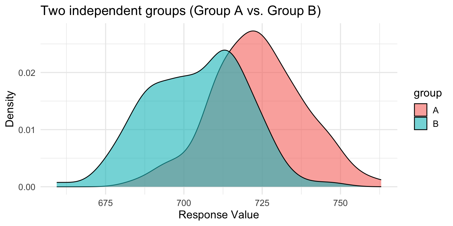Interpretation: - Intercept (groupA) = 723.63 (mean of group A) - groupB coefficient = -19.46 (difference from A) - Group B is about 20 units lower than Group A
