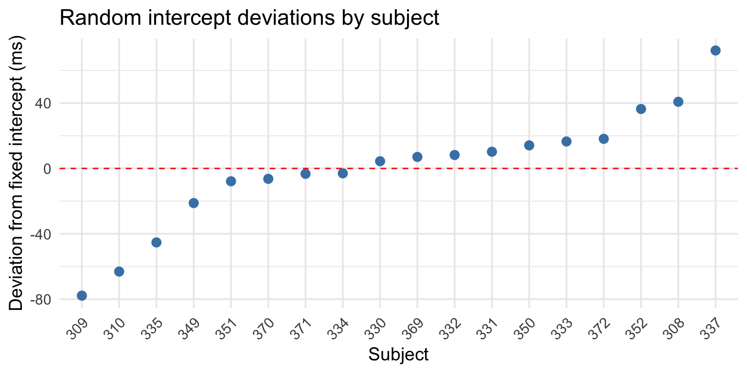 Each subject’s fitted intercept = fixed intercept + random deviation: