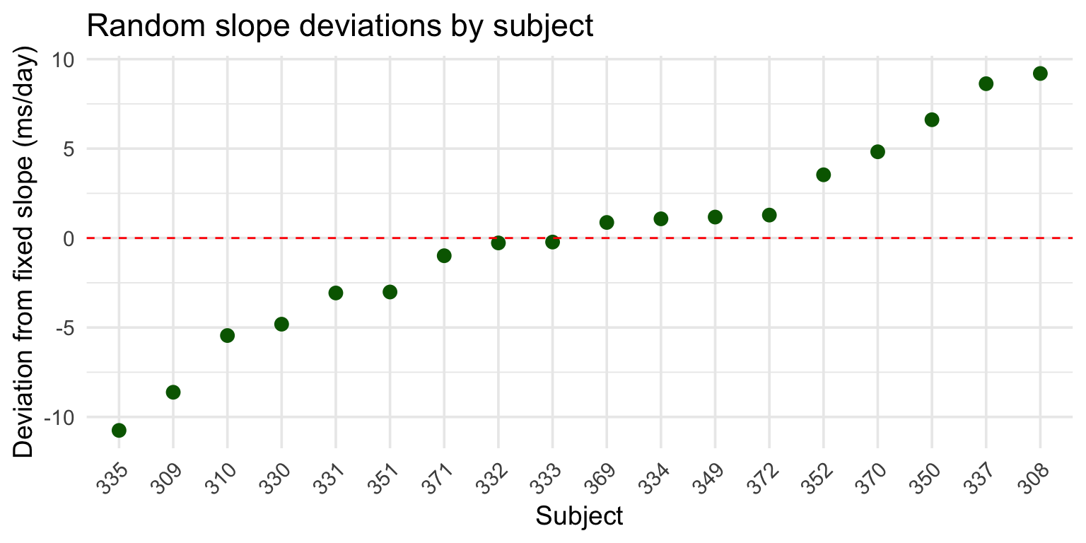 Subject 308’s RT increases by ~19.67 ms per day (vs. population average of ~10.47 ms).