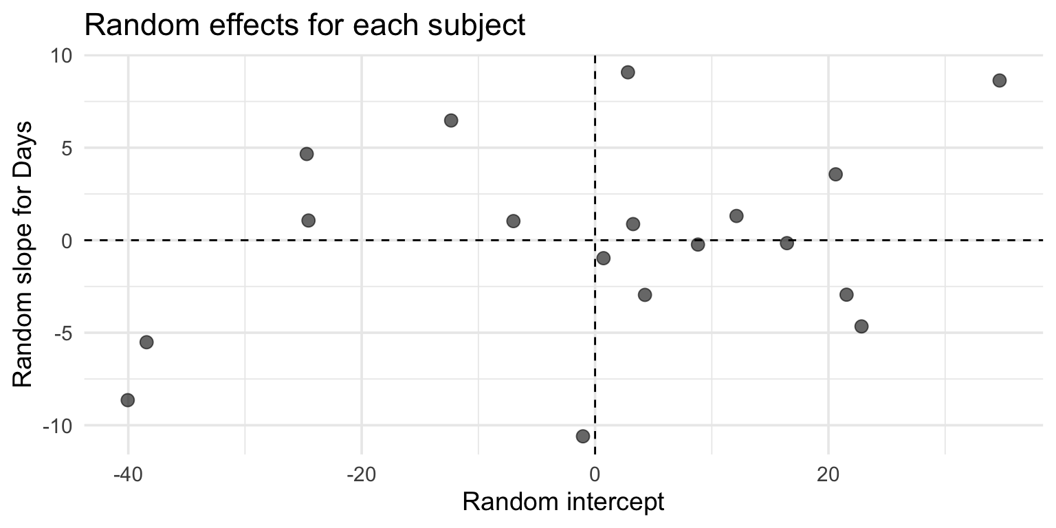 1 = random interceptDays = random slope for Days| = grouped bySubject = grouping variableAfter fitting the model, you can extract the random effects: