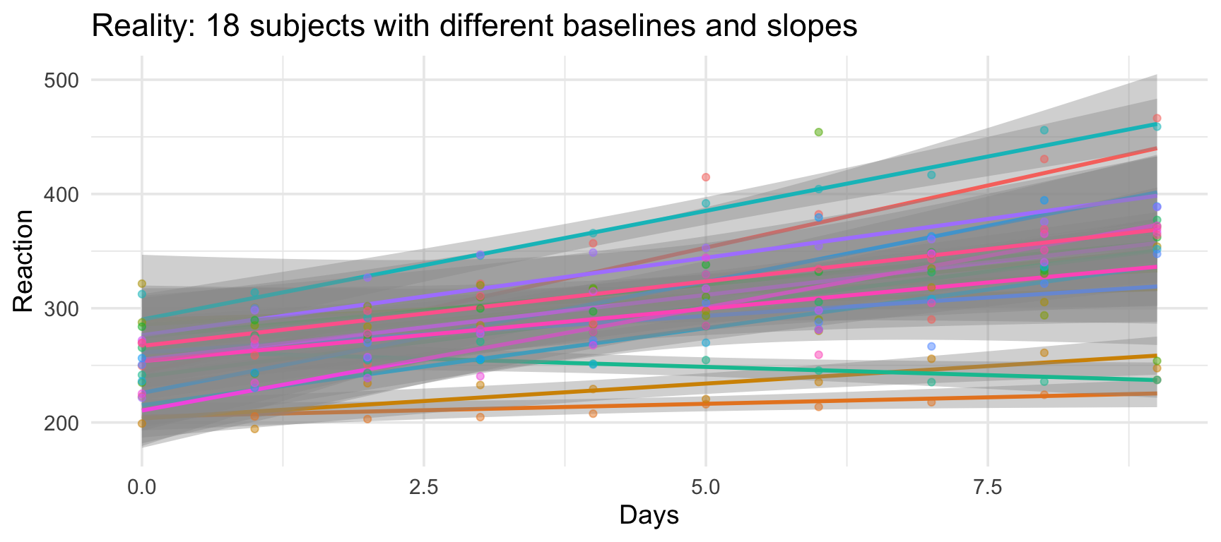 Reaction ~ Days: Fixed effect of Days on Reaction(1 | Subject): Random intercept for each Subject