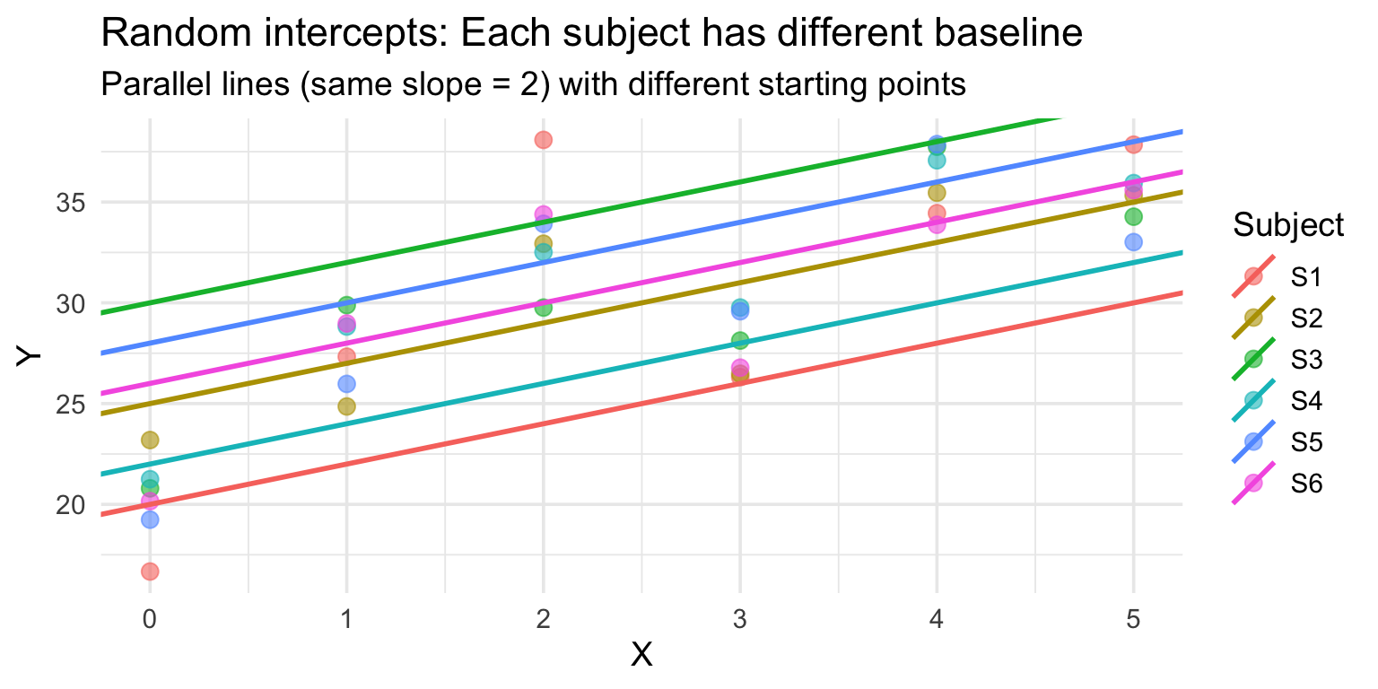 Random intercepts allow each group (e.g., subject) to have its own baseline: